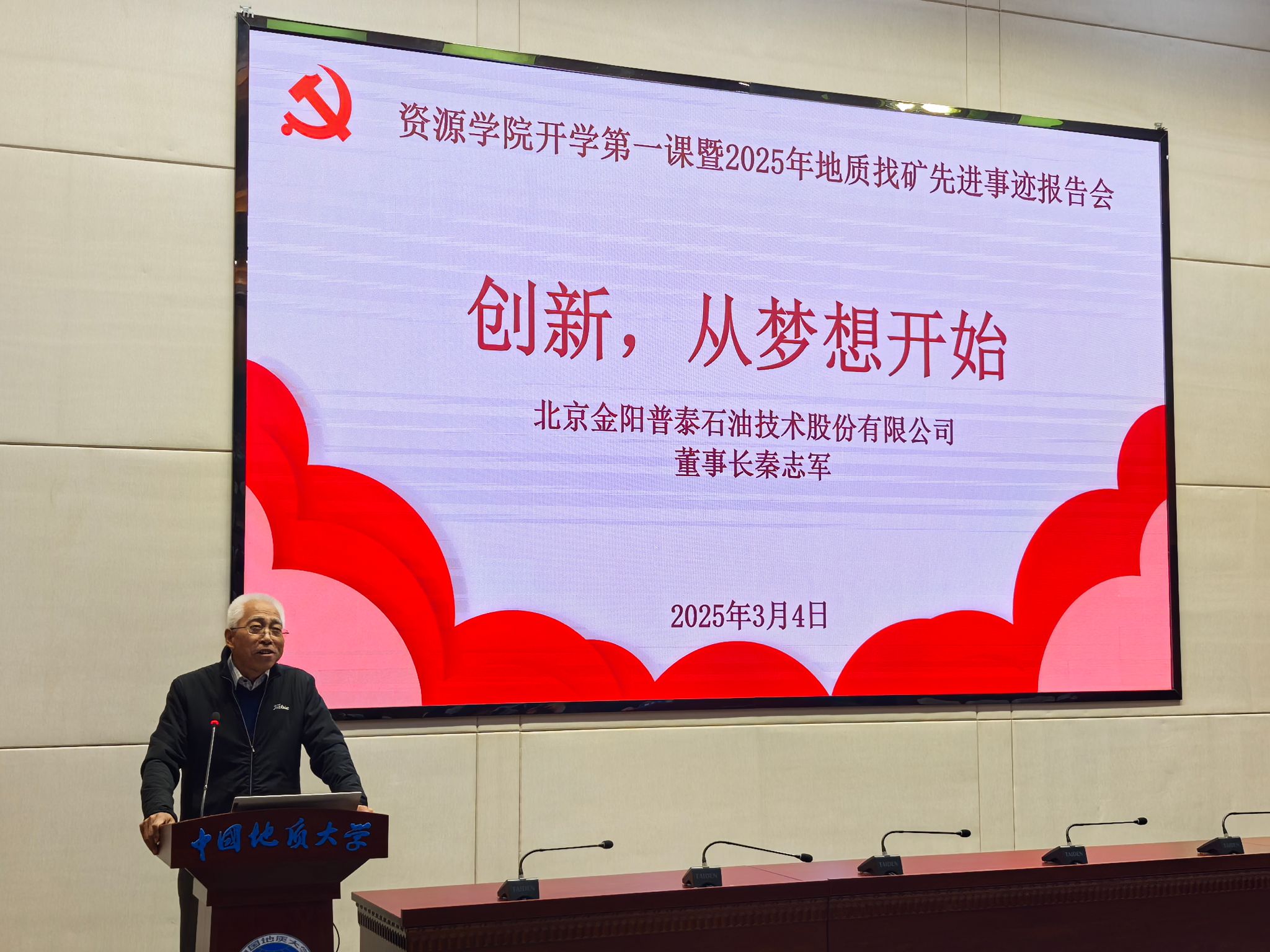 3月4日,学院举行“开学第一课暨地质找矿先进事迹报告会”。北京金阳普泰石油技术股份有限公司董事长秦志军、总经理袁钢辉,公司武汉代表胡甫强、王亚婧,学校党委学生工作部部长朱丹,Beat365中文官方网站党委书记汪再奇,党委副书记谭文伦,副院长李占轲,教师代表谢丛姣参加,举行了金阳普泰创新奖学金颁发仪式、校外兼职辅导员聘任仪式。秦志军在开学第一课中讲到,创新的源头在于梦想,而梦想的实现离不开切实的行动、扎实的学习和长久的坚持。他鼓励同学们要燃起梦想的火苗,敢想敢干、巧干实干,不畏艰难、不怕失败,在不断的实践中勇于创新,敢于追逐更加辉煌的梦想!
