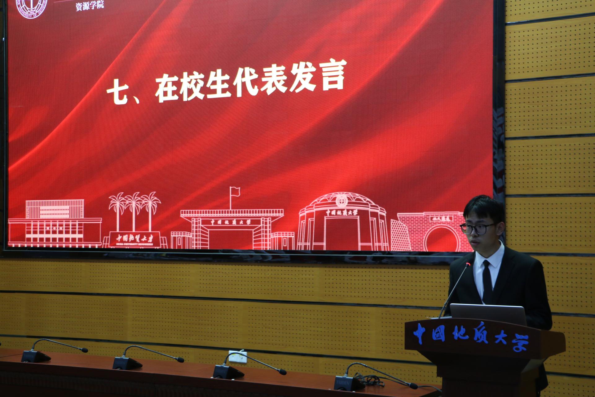 在校生代表、学生会主席团成员马玮发言。他谈到,要向老师们、学长学姐学习,传承地质三光荣四特别精神,秉持“艰苦朴素、求真务实”的校训精神,用自己实际的行动,努力学习,为国家的资源能源事业贡献青春力量!