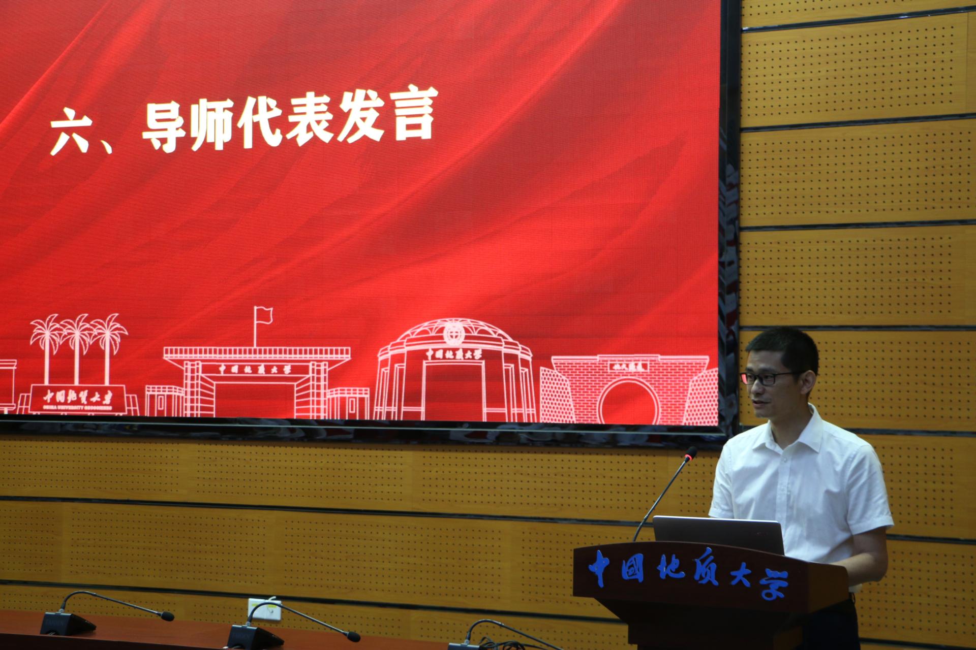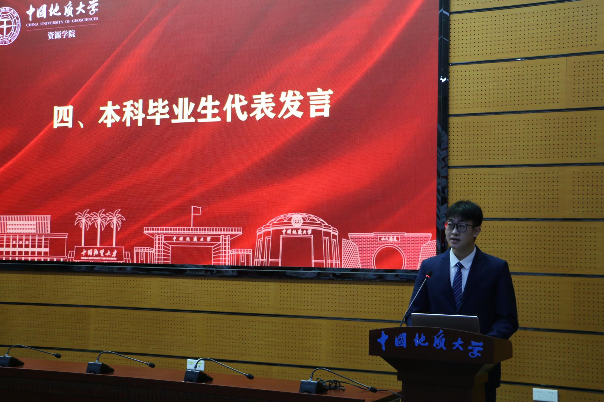 研究生毕业生代表、地质资源与地质工程专业程茂策发言。他谈到地大不仅是一个学习的地方,更是收获了许多宝贵友谊和人生经验的地方。地大给大家提供了广大的舞台去实现梦想。无论走得多远,“艰苦朴素 求真务实”的校训都会深深烙印在地大学子的心里,“求实进取 勇攀高峰”激励着学子在追求真理的道路上阔步前行。