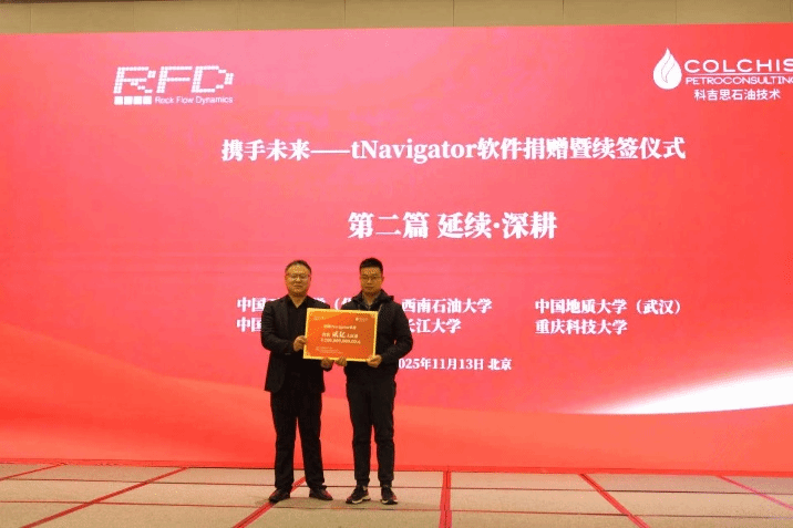 2025年11月13日,应科吉思石油技术咨询(北京)有限公司邀请,Beat365中文官方网站学术副院长杨峰和石油工程系教师雷霆出席了科吉思石油技术公司和俄罗斯Rock Flow Dynamics (RFD)公司联合举办的《2025精细油气藏高效勘探开发学术交流会暨tNavigator技术研讨会》暨tNavigator 软件捐赠仪式。