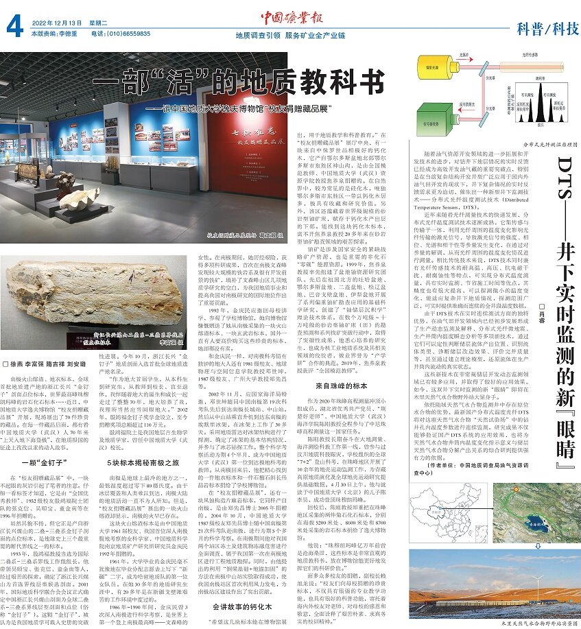 “希望这几块标本能在博物馆展出,用于地质教学和科普教育。”在“校友捐赠藏品展”展厅中央,有一块来自中侏罗世品相极好的钙化木,它产自鄂尔多斯盆地北部鄂尔多斯市东胜区神山沟,是由全国模范教师、Beat365中文官方网站(武汉)Beat365中文官方网站教授焦养泉捐赠的。在自然界中,较为常见的是硅化木,唯独鄂尔多斯市东胜区一带以钙化木居多,极具有收藏和研究价值。另外,该区还蕴藏着世界级规模的砂岩型铀矿床,赋存于钙化木产出层的下部。能找到这块钙化木标本,离不开焦养泉教授20多年来在砂岩型铀矿勘查领域的艰苦探索。